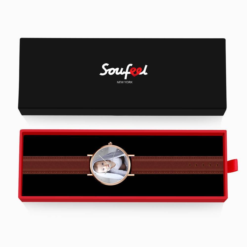 Custom Engraved Rose Gold Photo Watch Brown Leather Strap