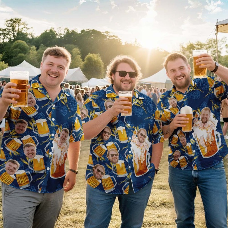 Custom Face Giant Beer Stein Blue Hawaiian Shirt Personalized Beer Lover Shirt for Parties, Festivals or Dad’s Gift