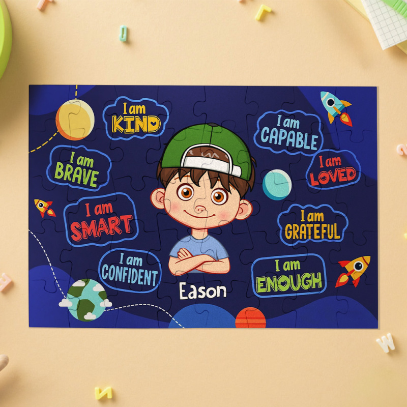 Kids Custom Jigsaw Puzzle | Self-affirmation “I Am Smart” with Name for Boys & Girls | Girls in Rainbow & Boys in Rocket and Universe Design