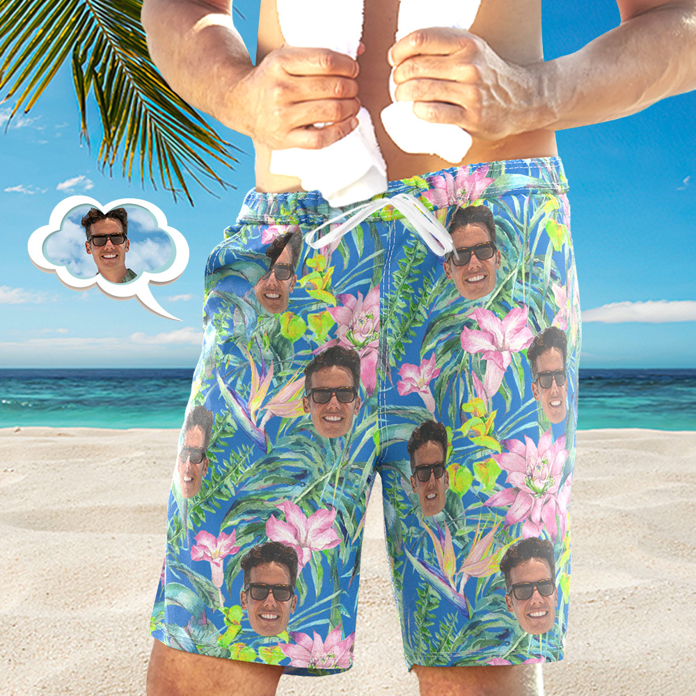 Men's Custom Face Beach Trunks Photo Shorts Beach Shorts Men's Photo Swim Trunks - Pink Flower