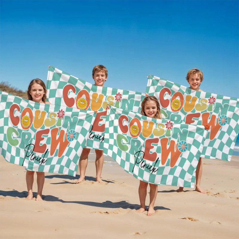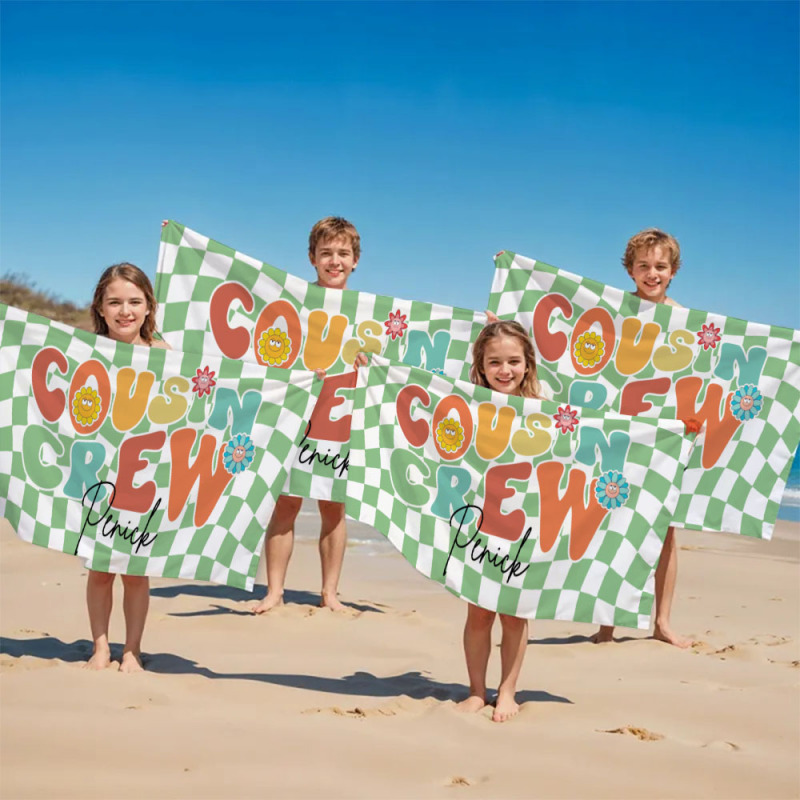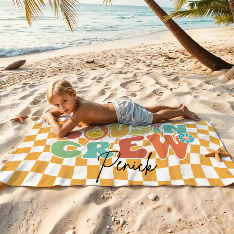 Personalised Cousin Crew Plaid Design Oversized Quick Dry Beach Towel with Name Birthday Summer Vacation Accessory Gift for Kids