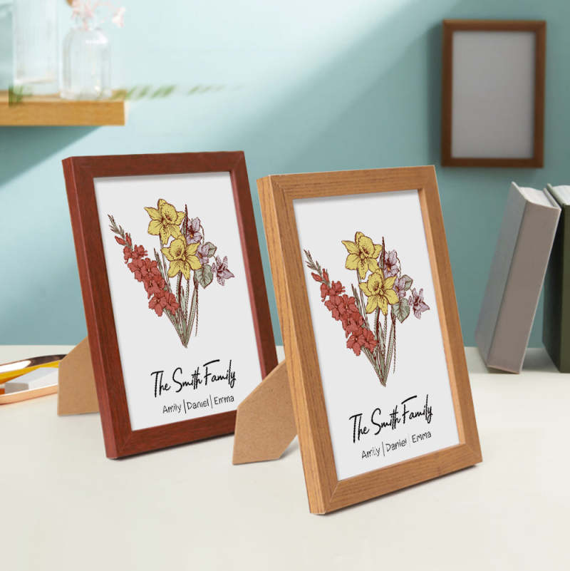 Personalized Birth flower Bouquet Beech Wood Names Frame Gift for Mom