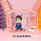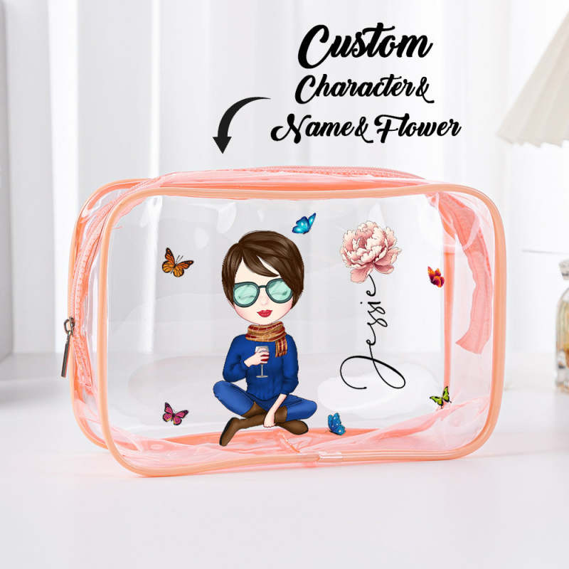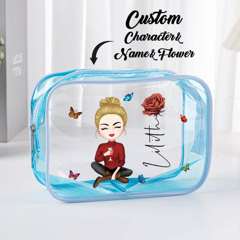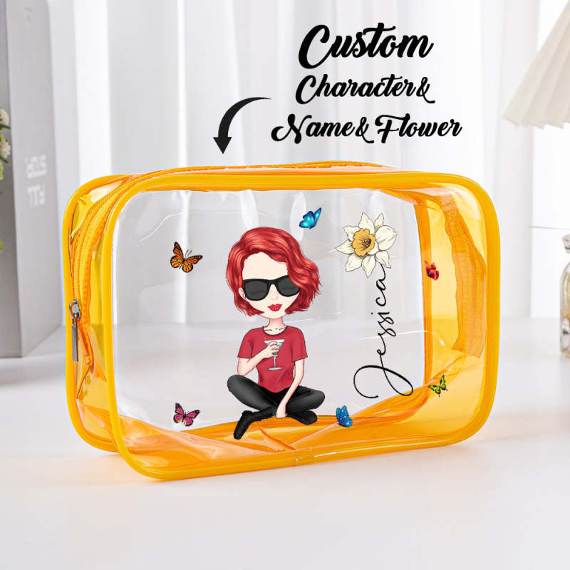 Personalized Cartoon Girl Birth Flower Clear Waterproof Makeup Bag with Name Birthday Gift for Her