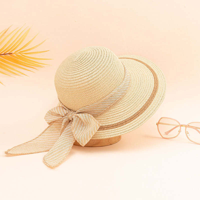 Women Straw Hat Beach Hats Striped Bow Knot Decor Sun Hat
